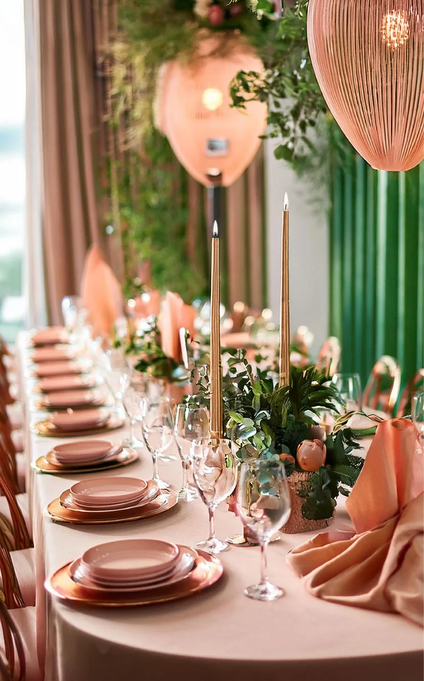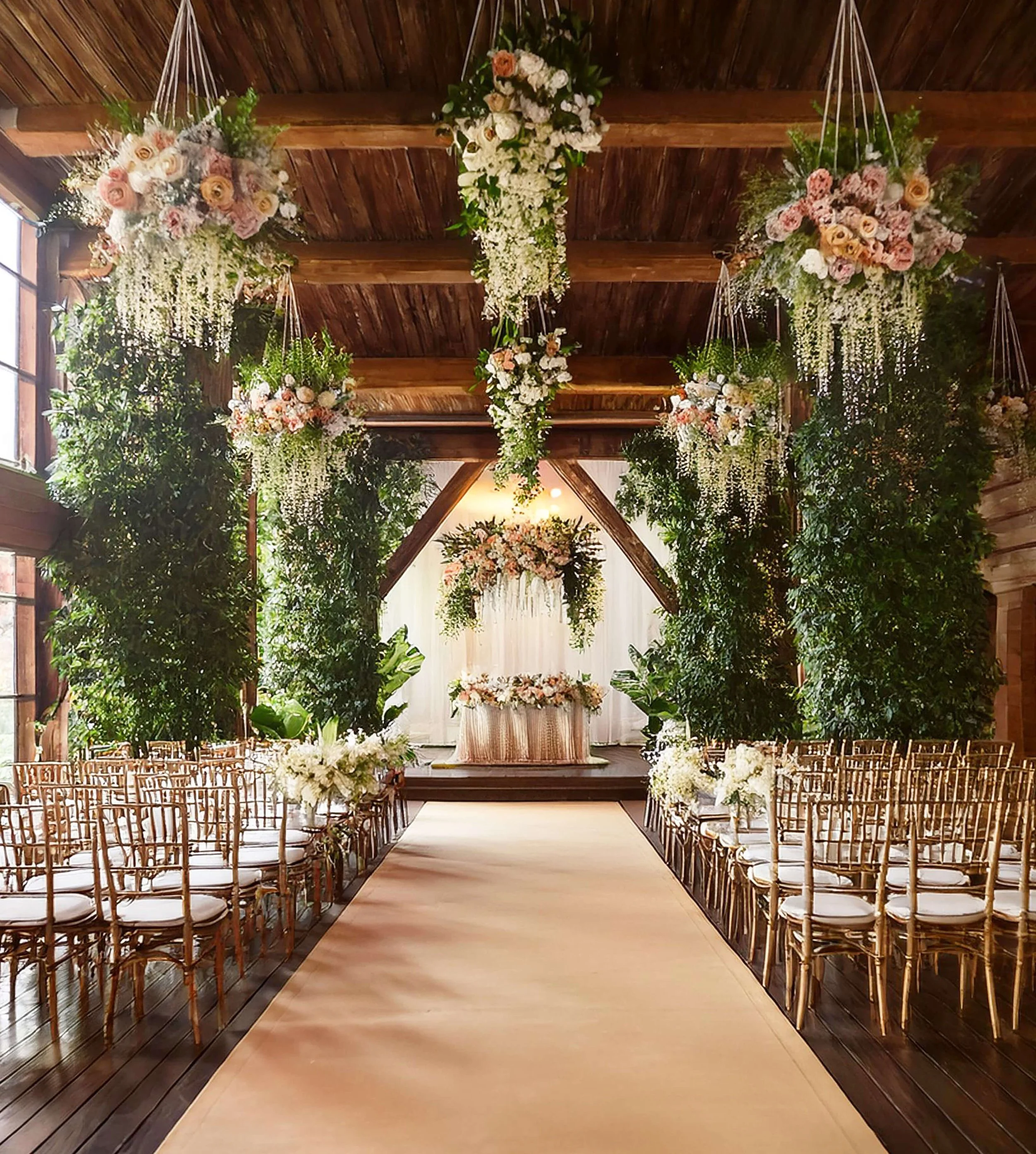 think IVY-DRAPED VENUES, POLISHED WOOD, AND FLORAL STYLING