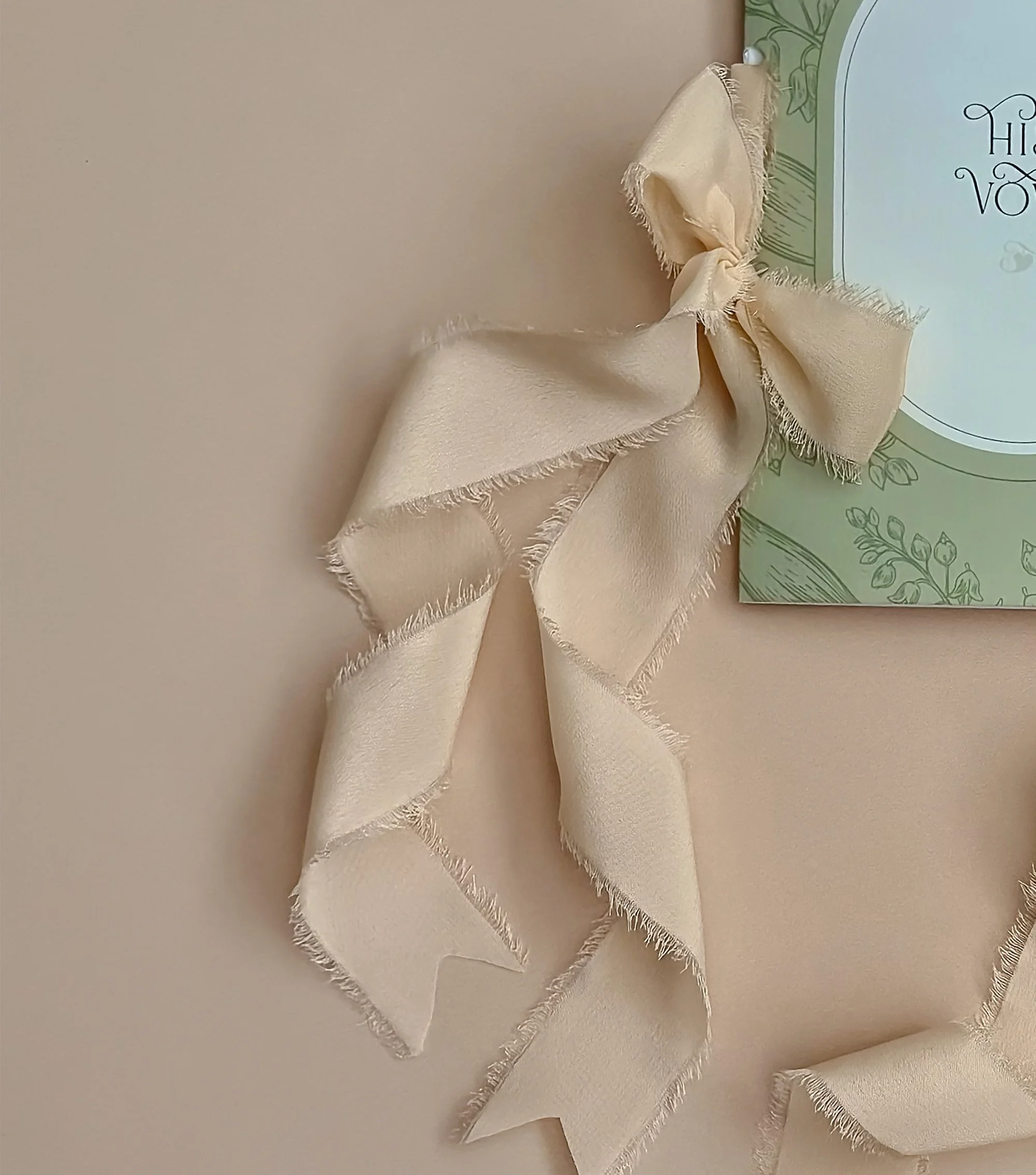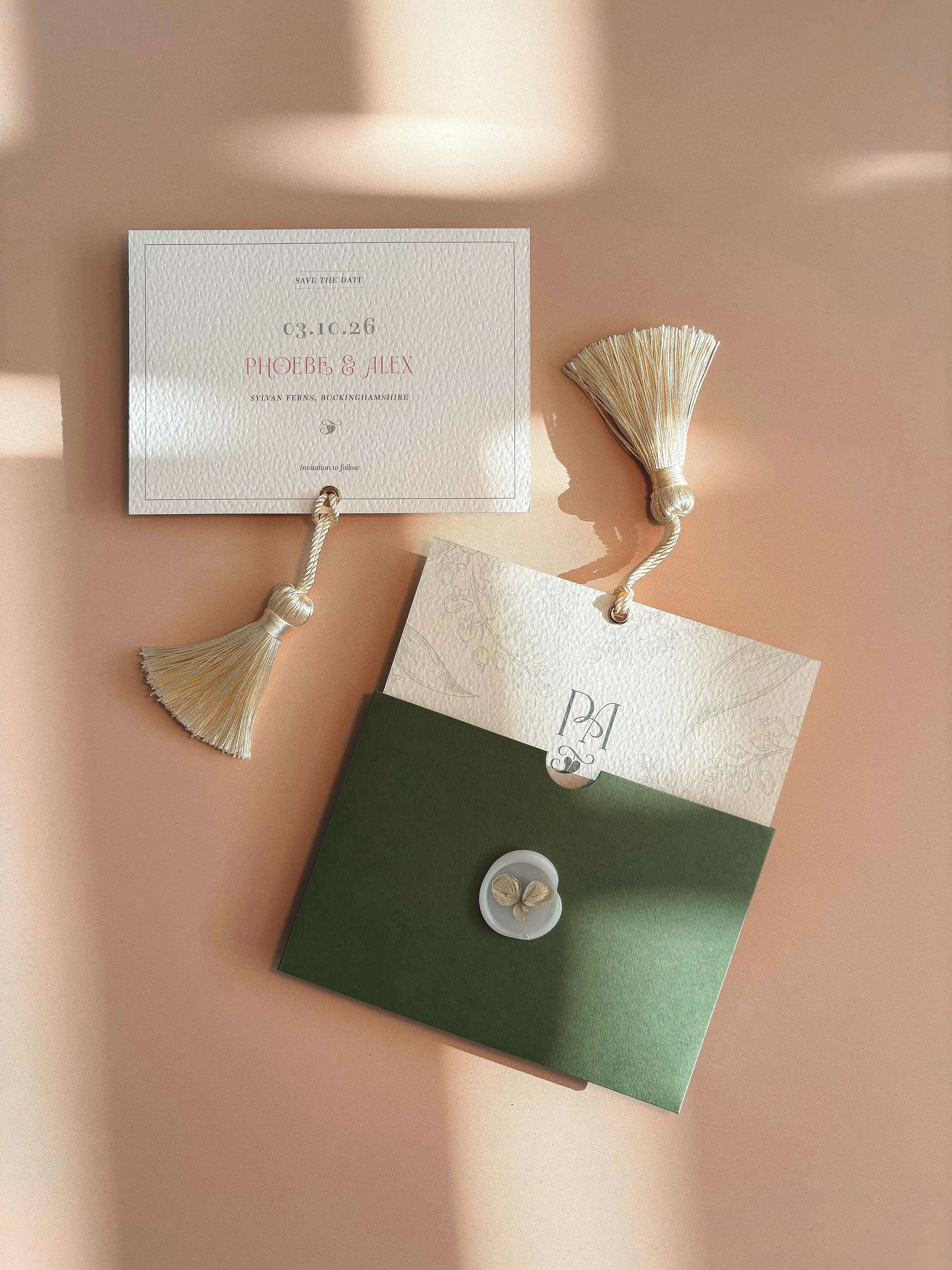 Luxurious crepe-de-chine silk ribbon, ivory tassels, and botanical wax seals add an heirloom finish to every piece.