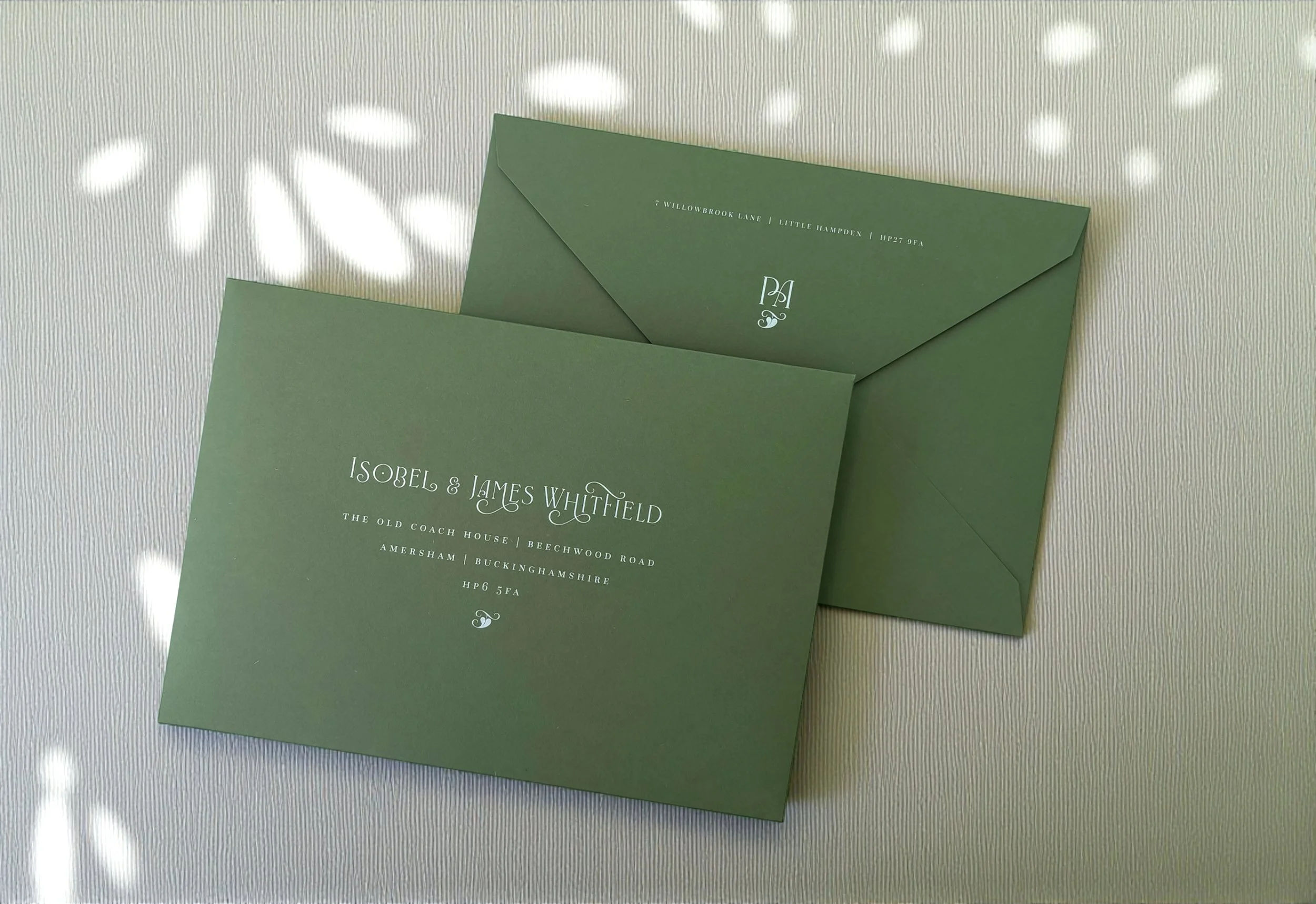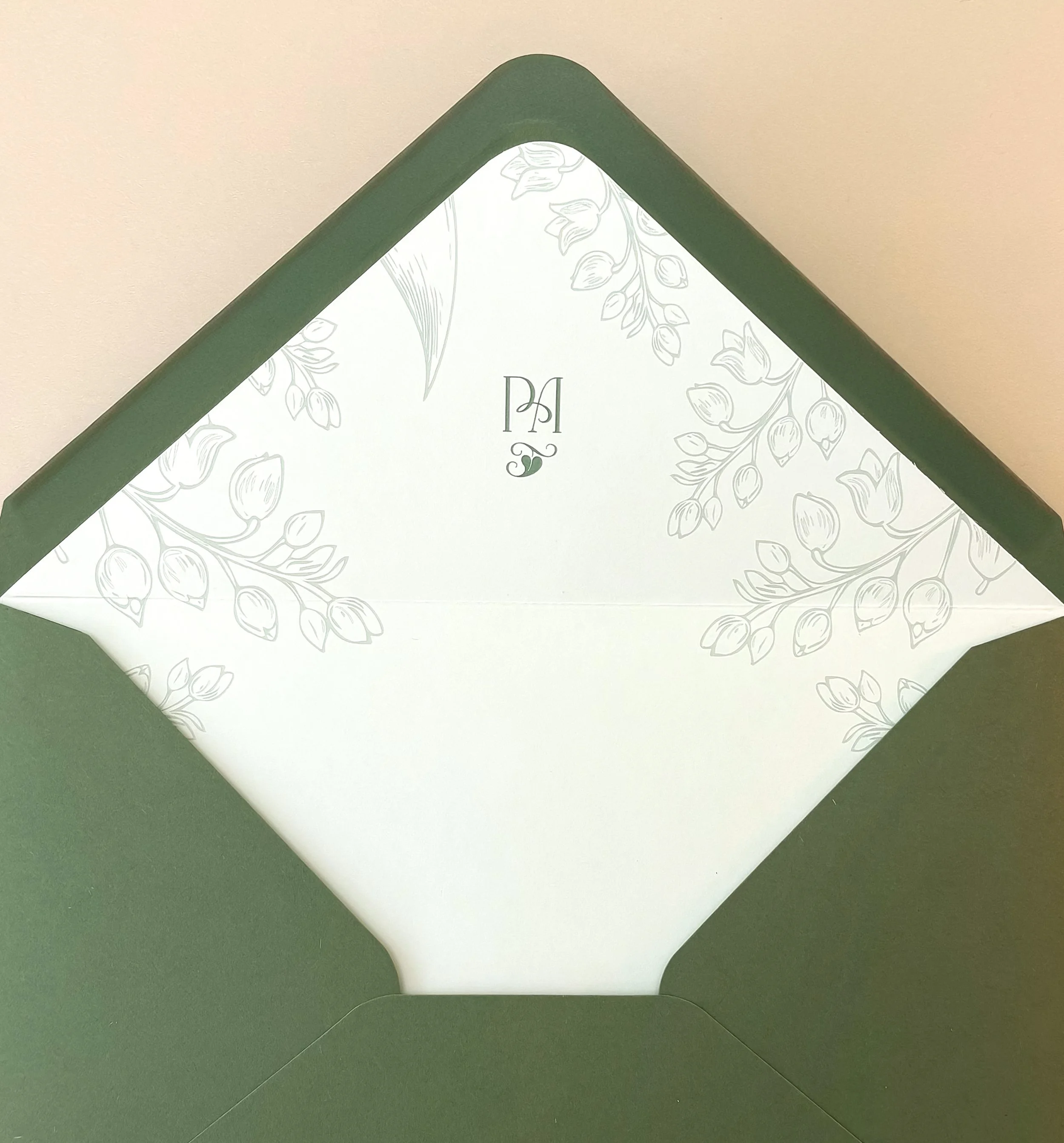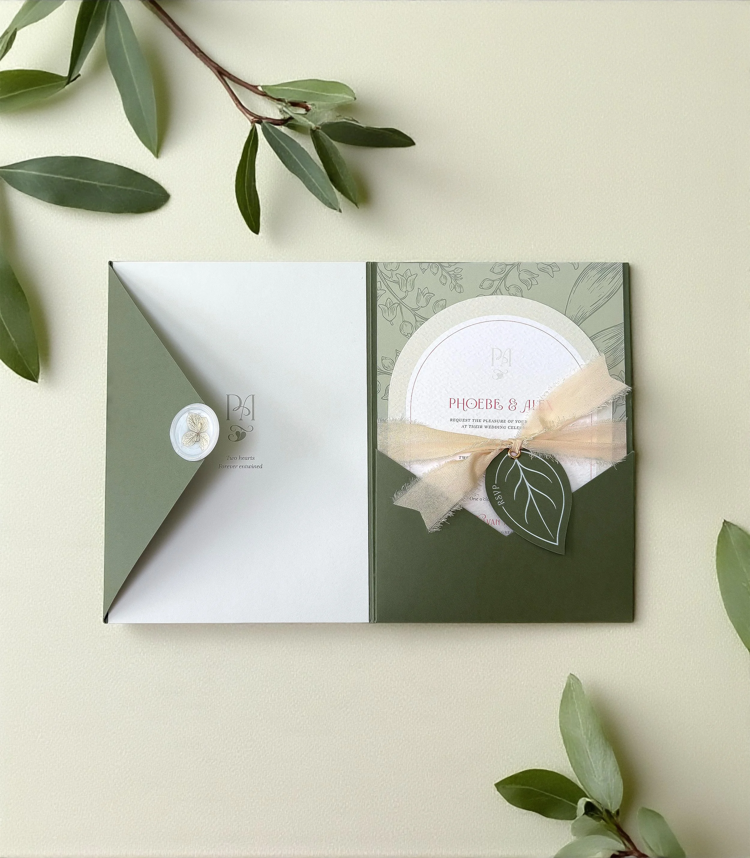 Crafted in deep sage and finished with a white wax seal pressed with a real hydrangea petal – a tactile, heirloom-style detail that makes every reveal moment unforgettable—