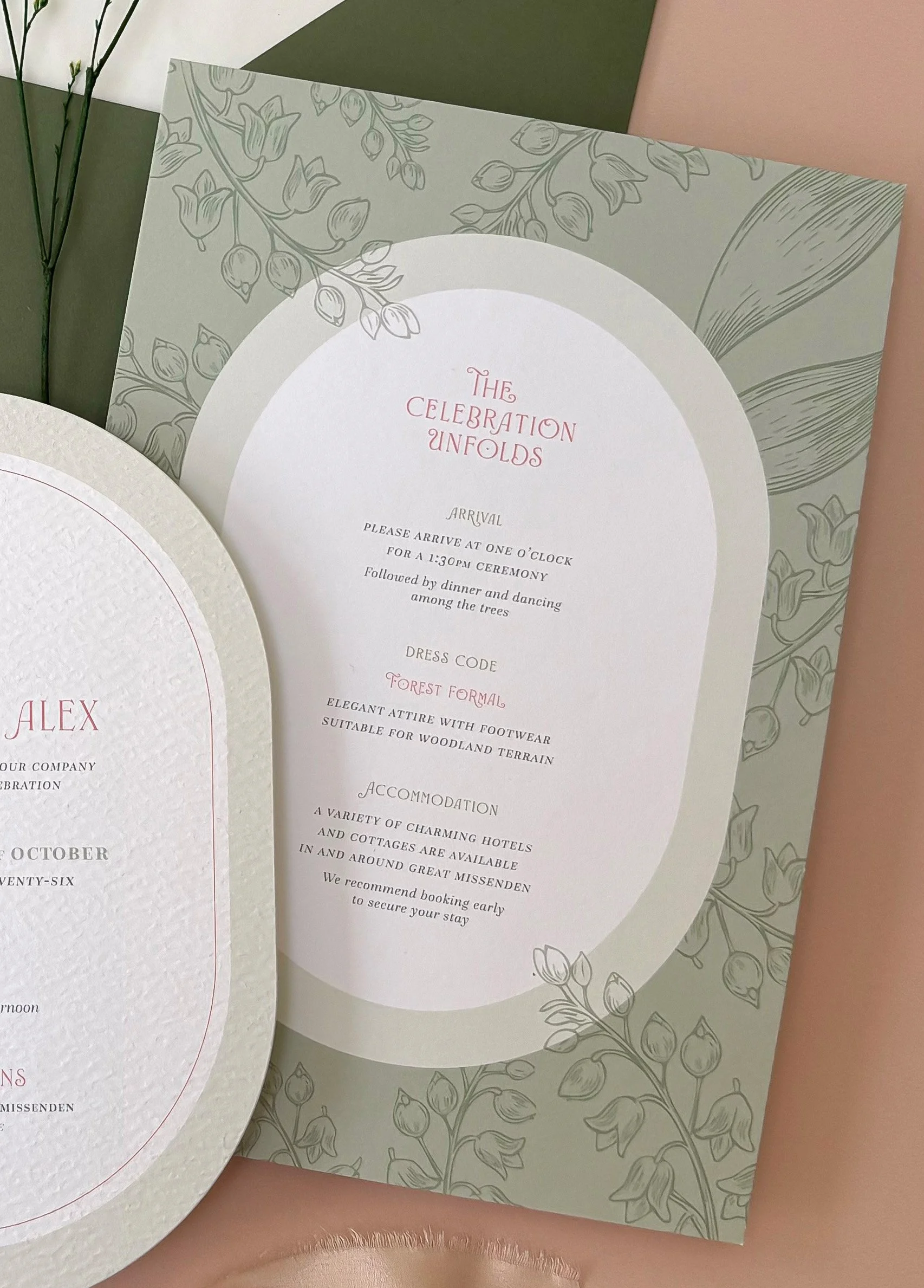 This is the moment your guests see the story unfold. With layered shapes, soft botanicals, and gentle detail, the Ever Entwined invitation feels timeless, organic, and deeply romantic.