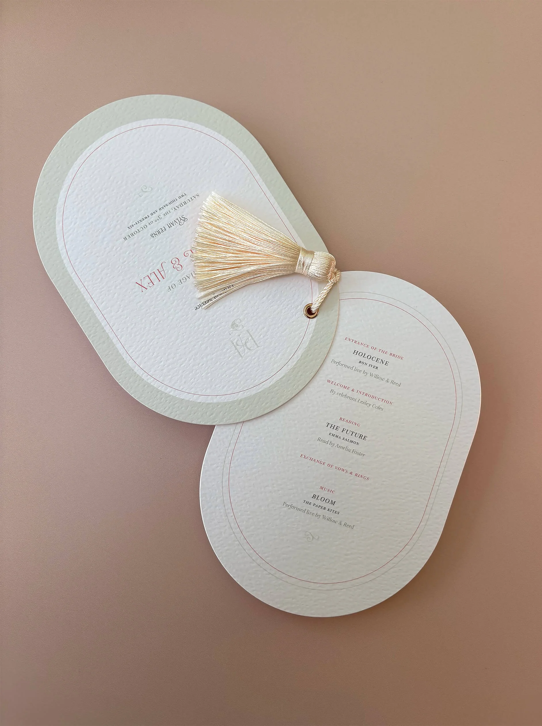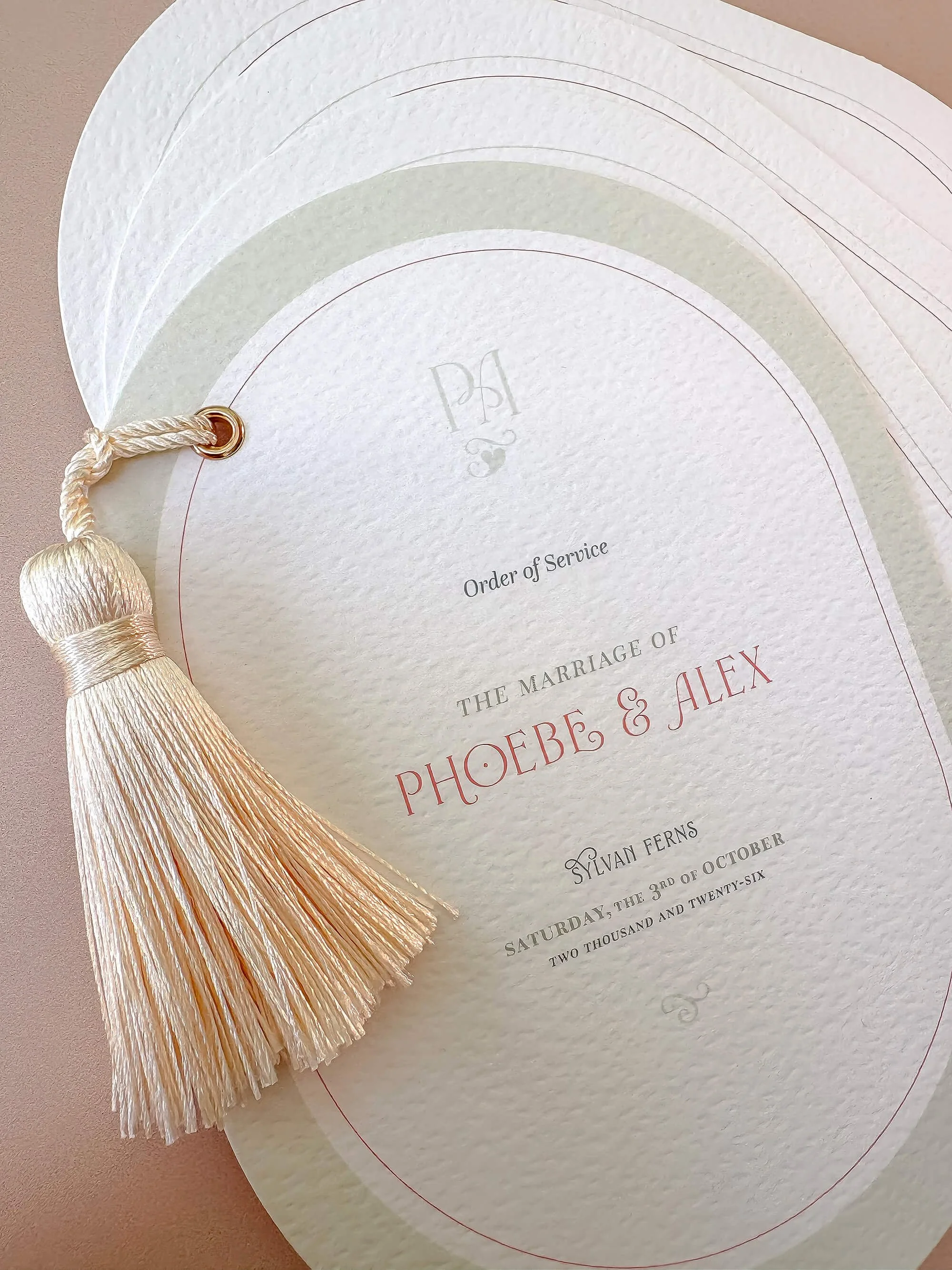 Soft ivory, sage, and blush tones that pair seamlessly with your Ever Entwined stationery suiteIvory tassel detailing