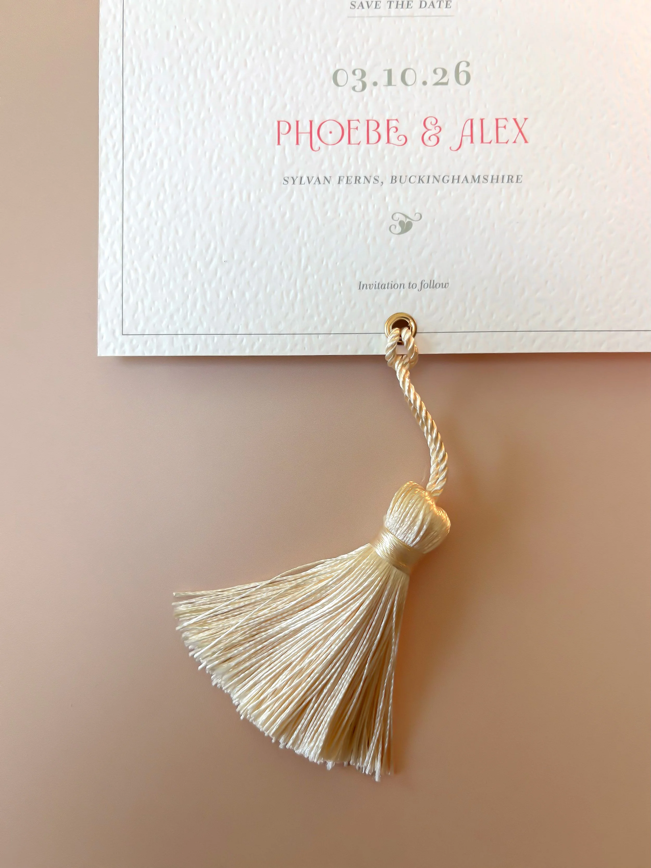 Beautifully finished with a gold eyelet and silky ivory tassel