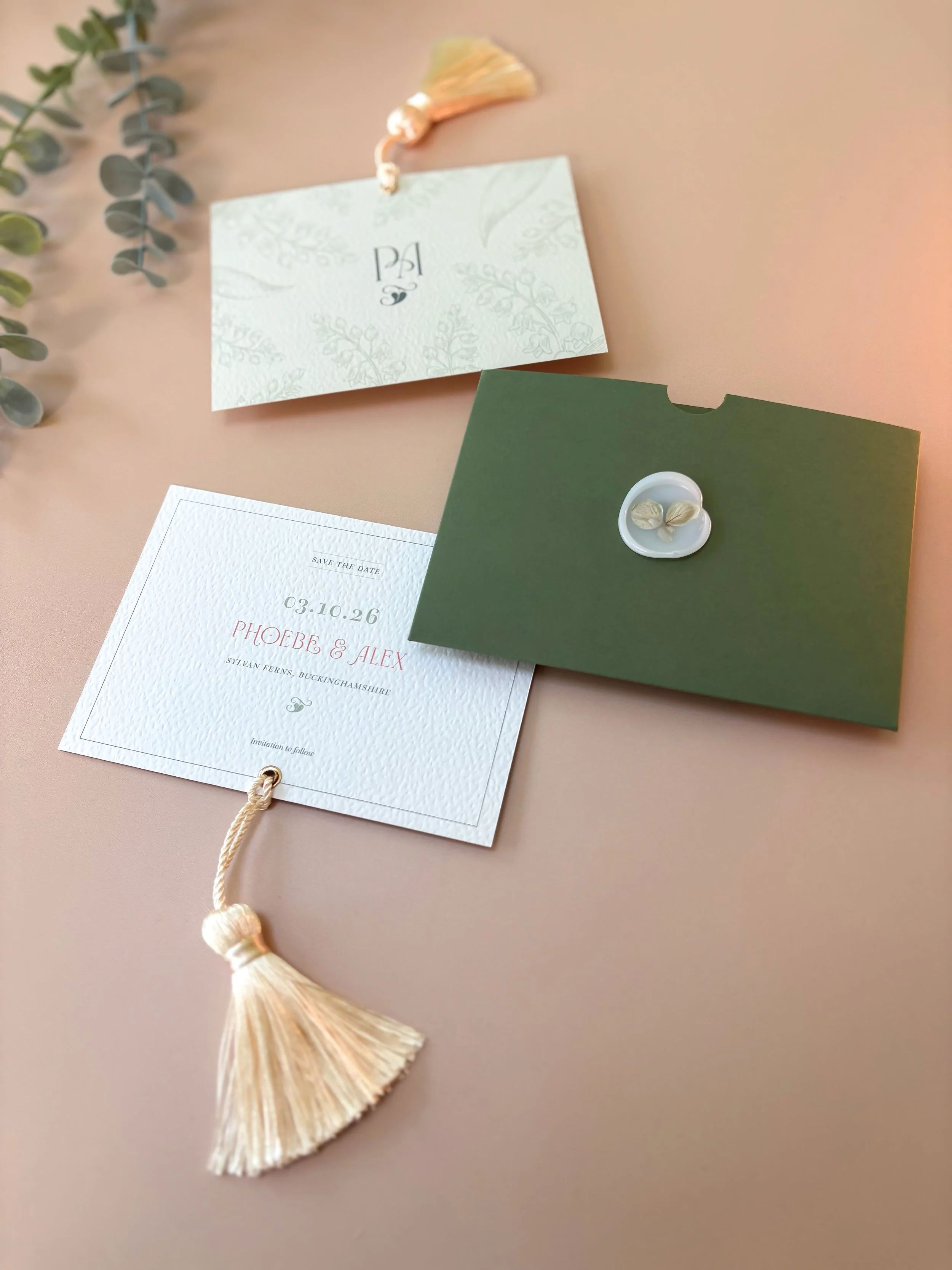 in deep sage Colorplan card and finished with a white wax seal pressed with a real hydrangea petal – creating a tactile, heirloom-quality first impression.—