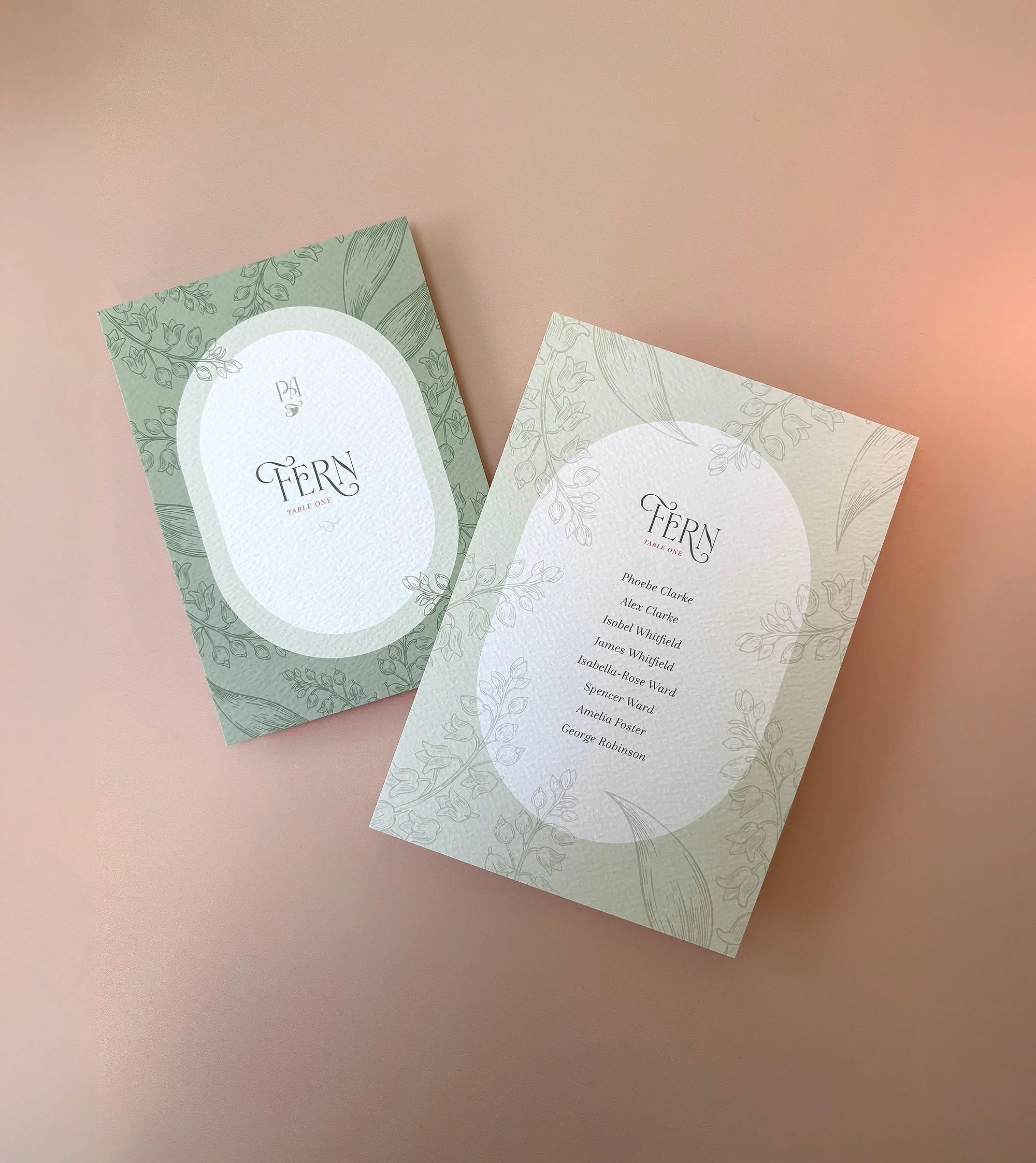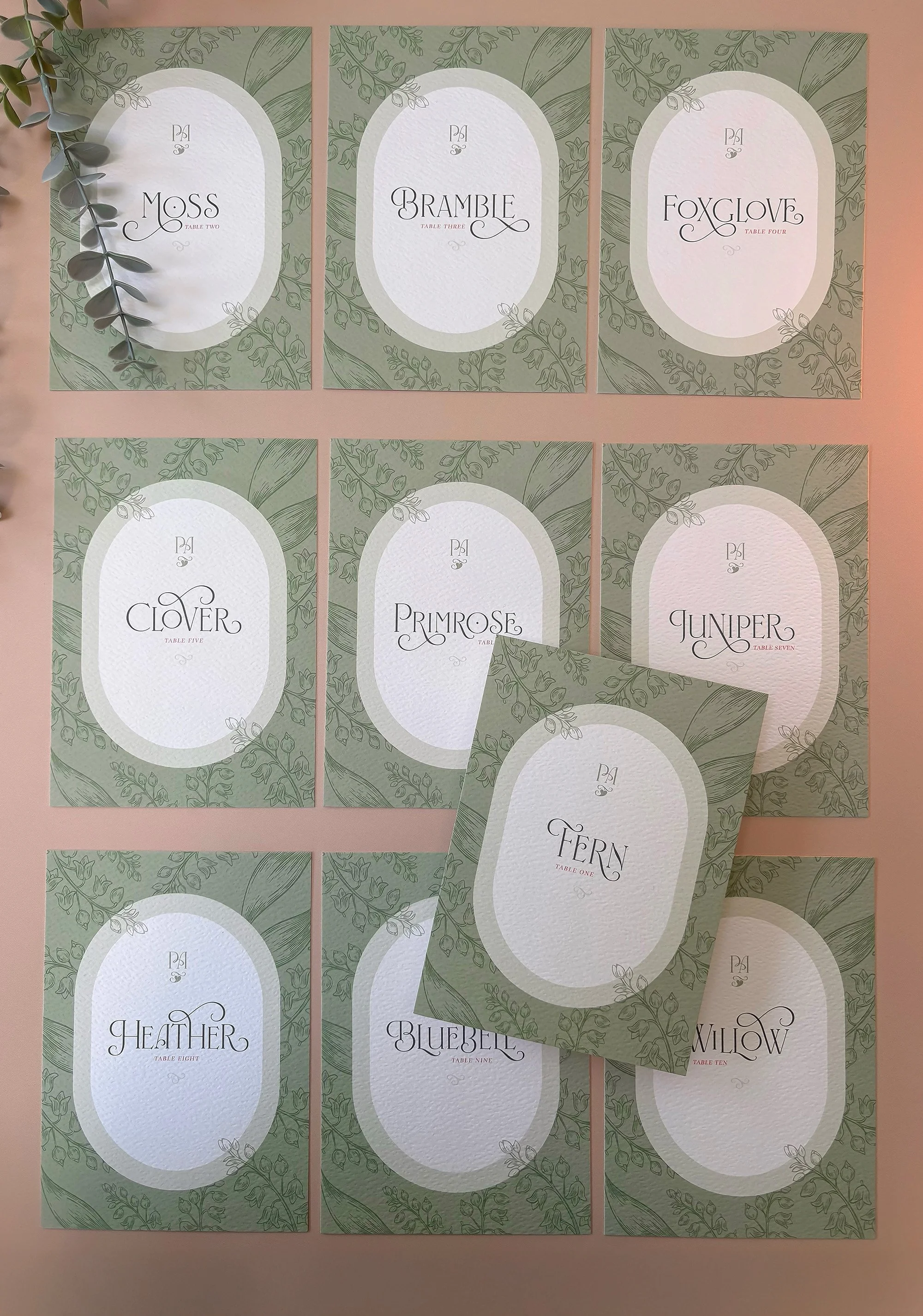 Each piece is printed on luxurious textured stock and features a botanical-inspired name, beautifully framed within an illustrated border.—