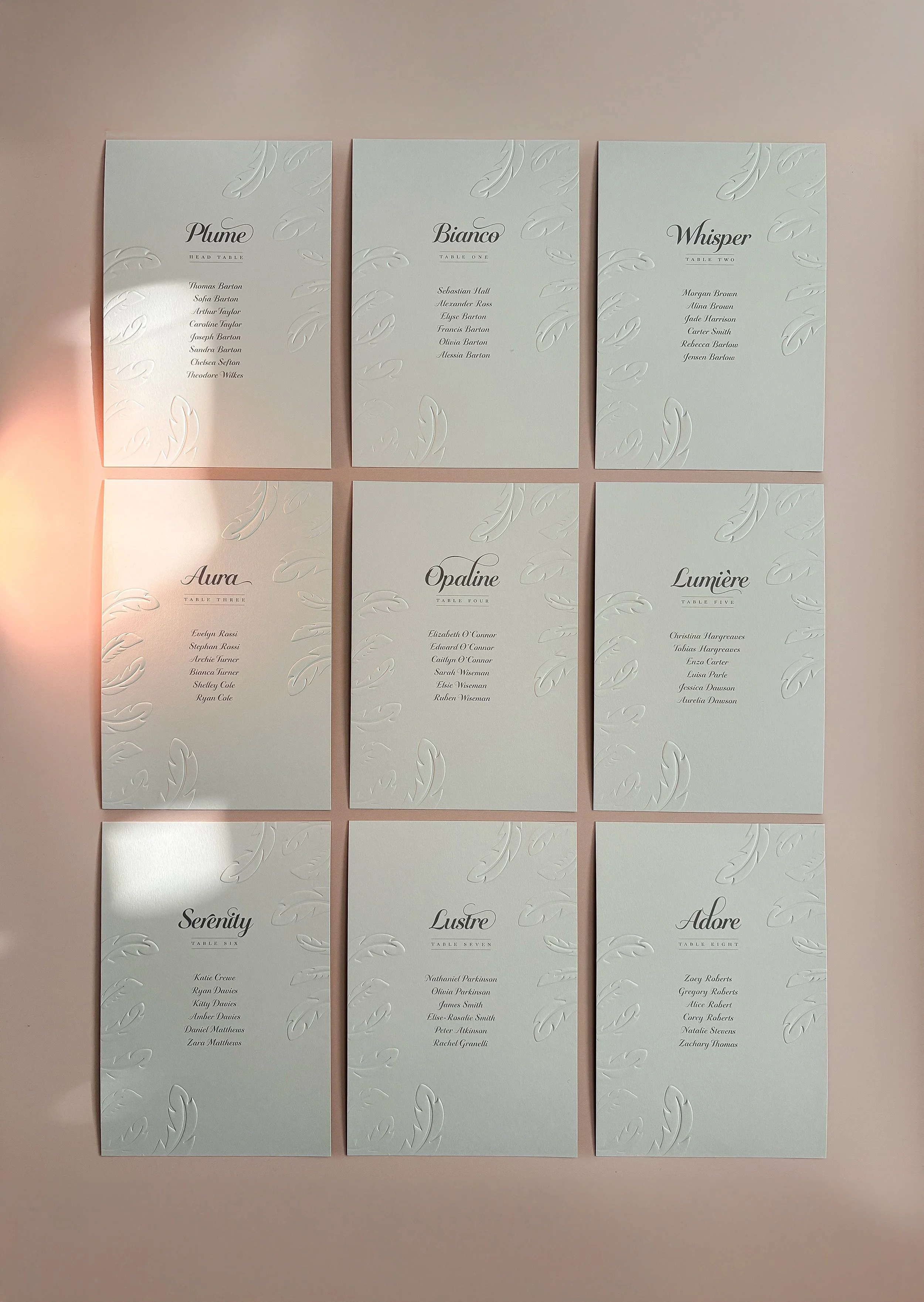 Each A5 table plan card features softly embossed feather detailing and refined typography, bringing a sense of harmony and sophistication to your seating display.