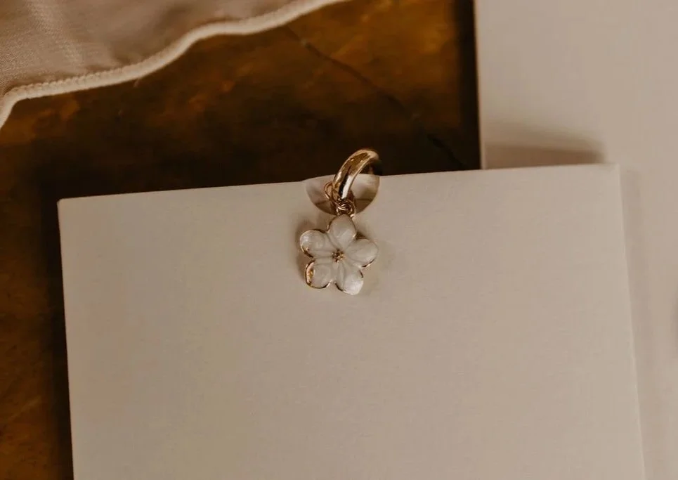 Beautifully tactile with a refined, embossed textureBound together with a luxe gold ring and finished with a delicate floral charm