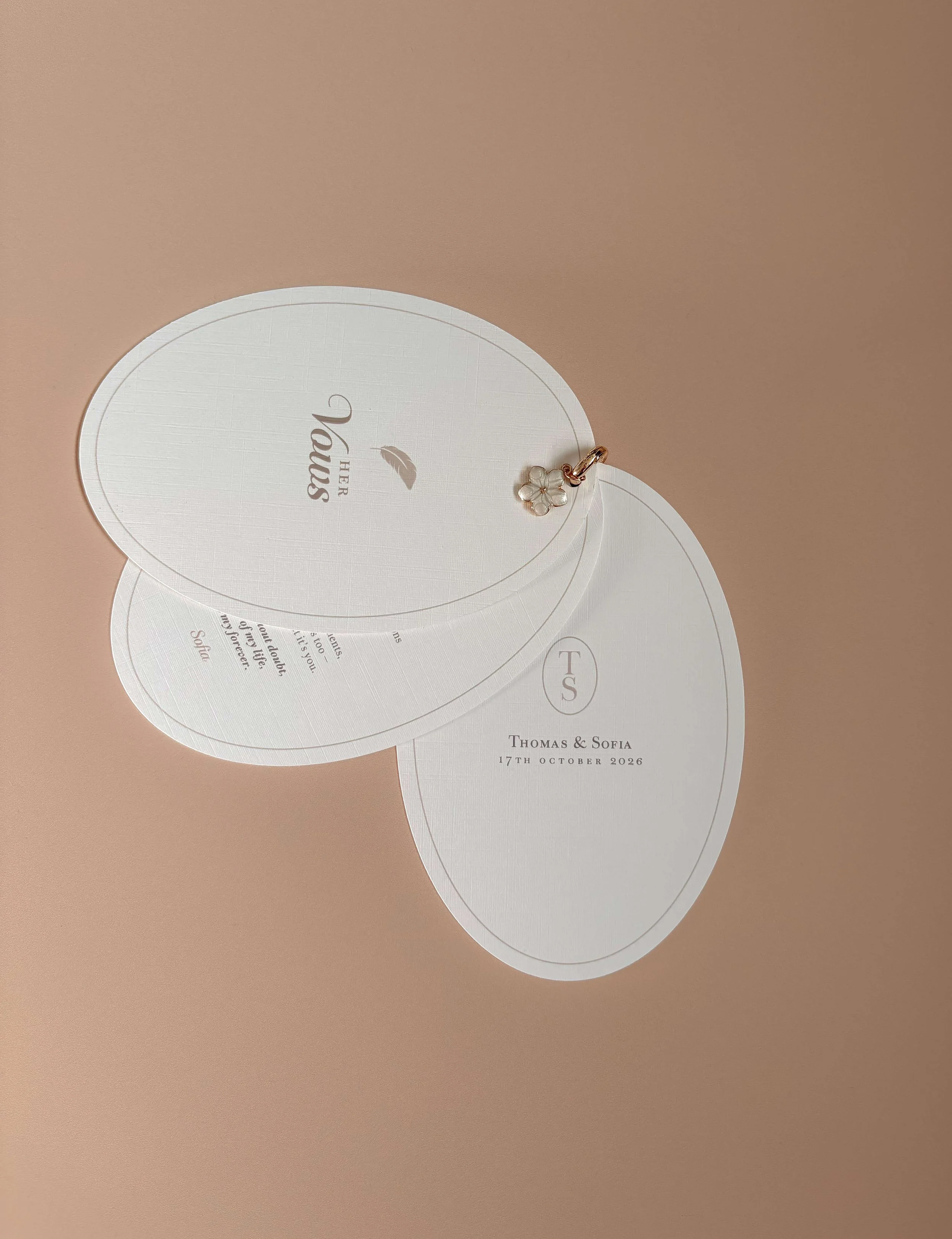 This version comes as two beautifully finished folded cards with clean, blank interiors – perfect for handwriting your vows on the day or as a keepsake.Each Vow Book consists of one folded card, totalling four pages: