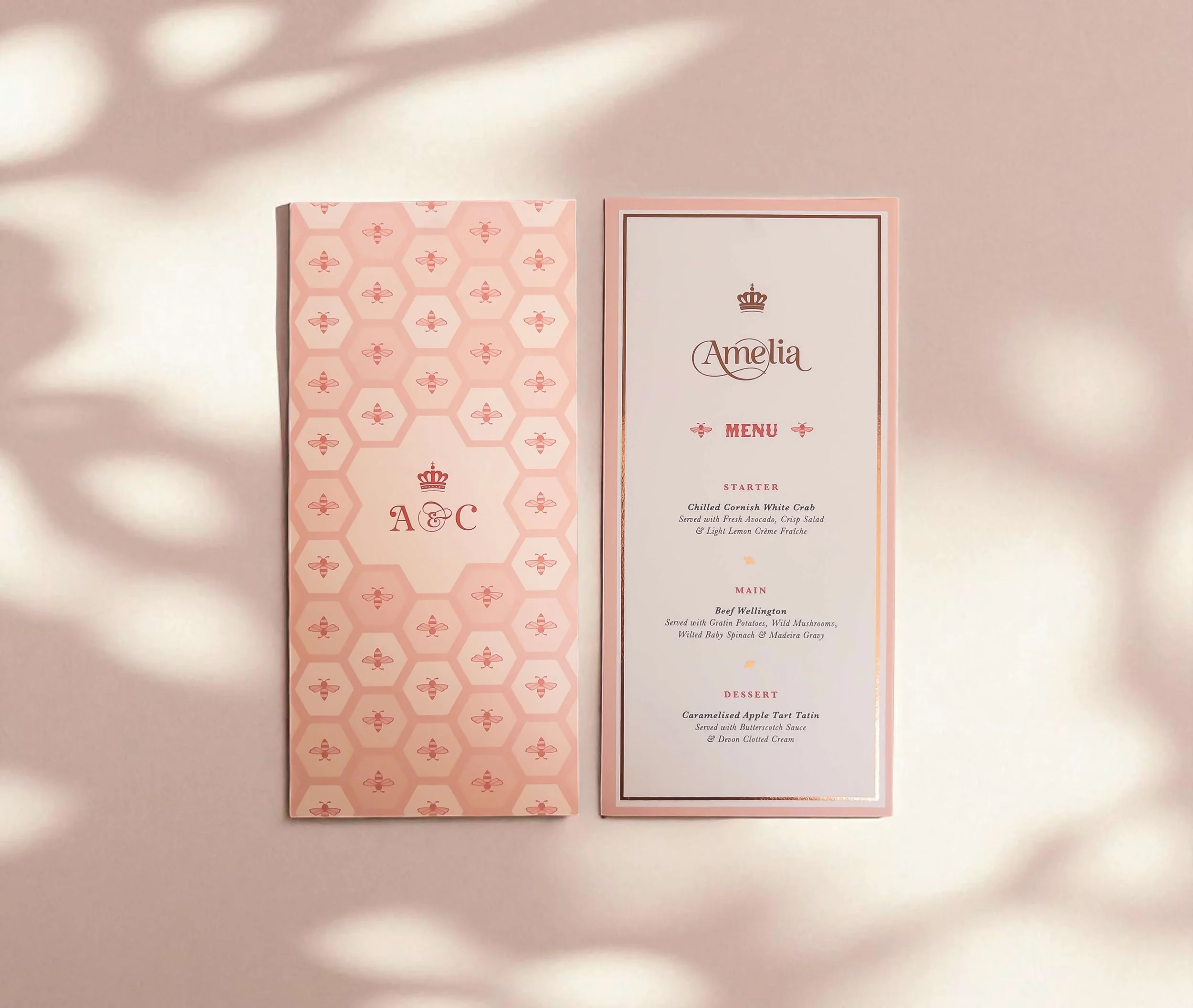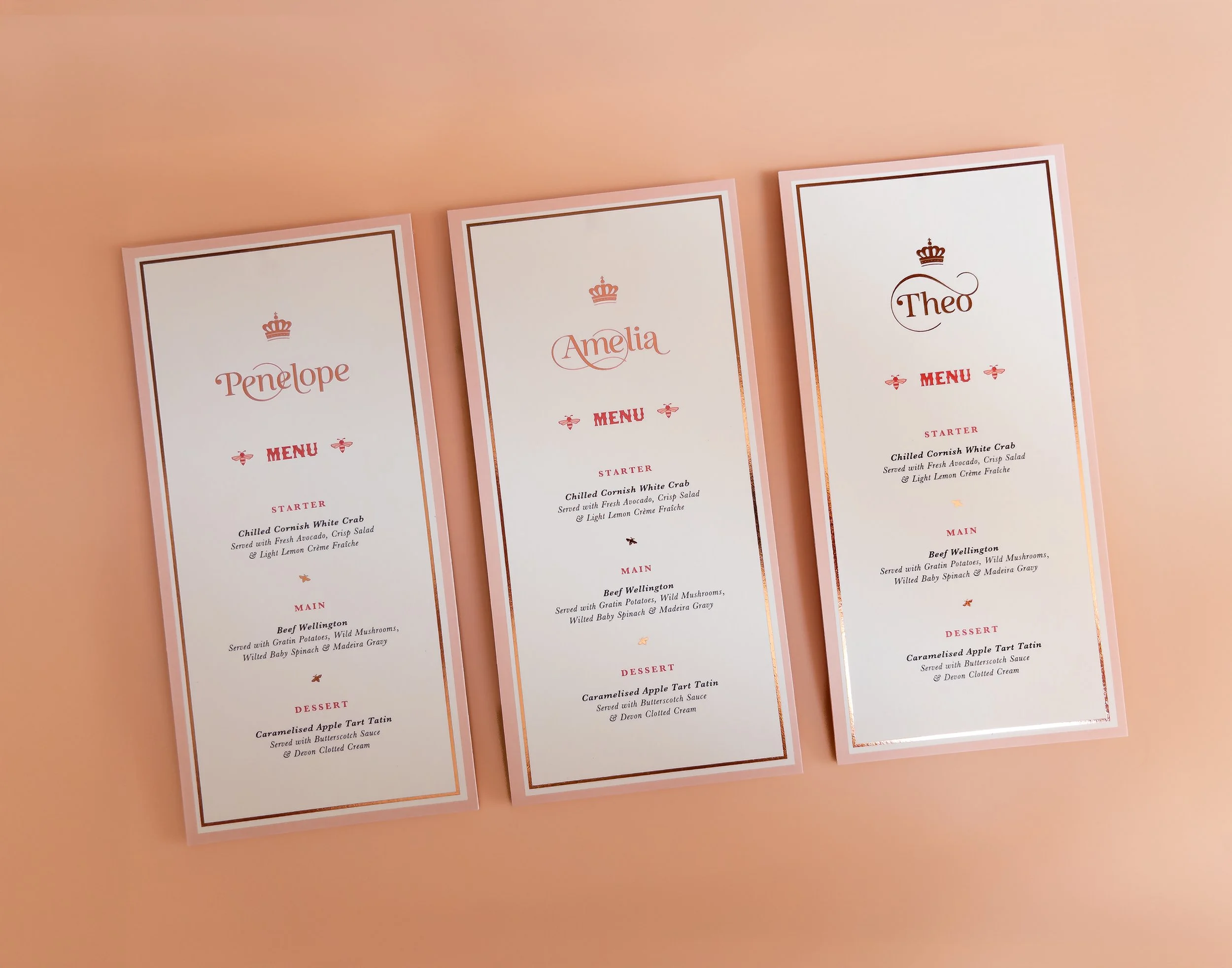 Ultra-thick 640gsm premium cardBeautifully typeset menu choices, tailored to your selections