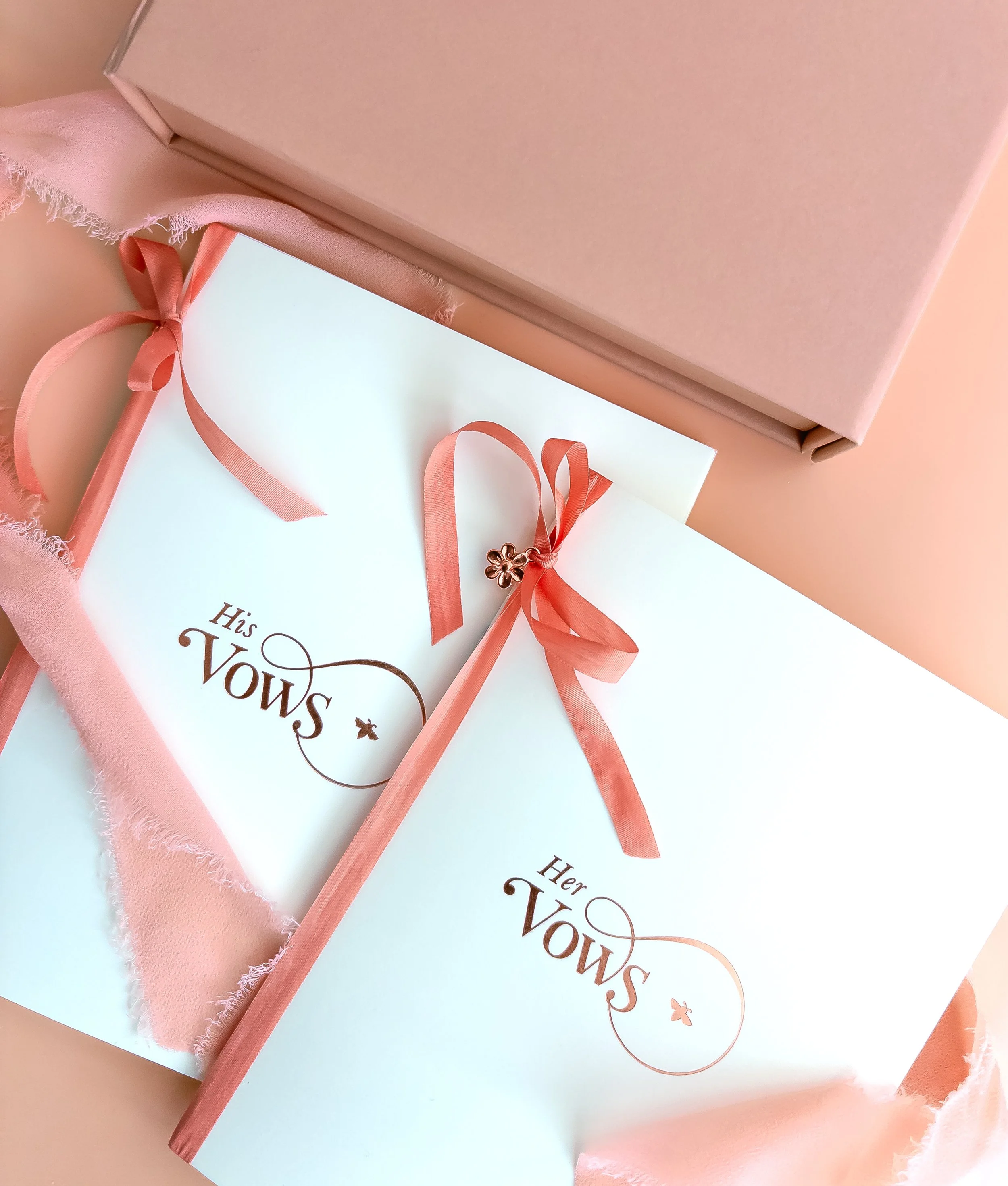 These beautiful vow books can be left blank inside for you to handwrite your vows, or they can be printed with your vows inside as a booklet.