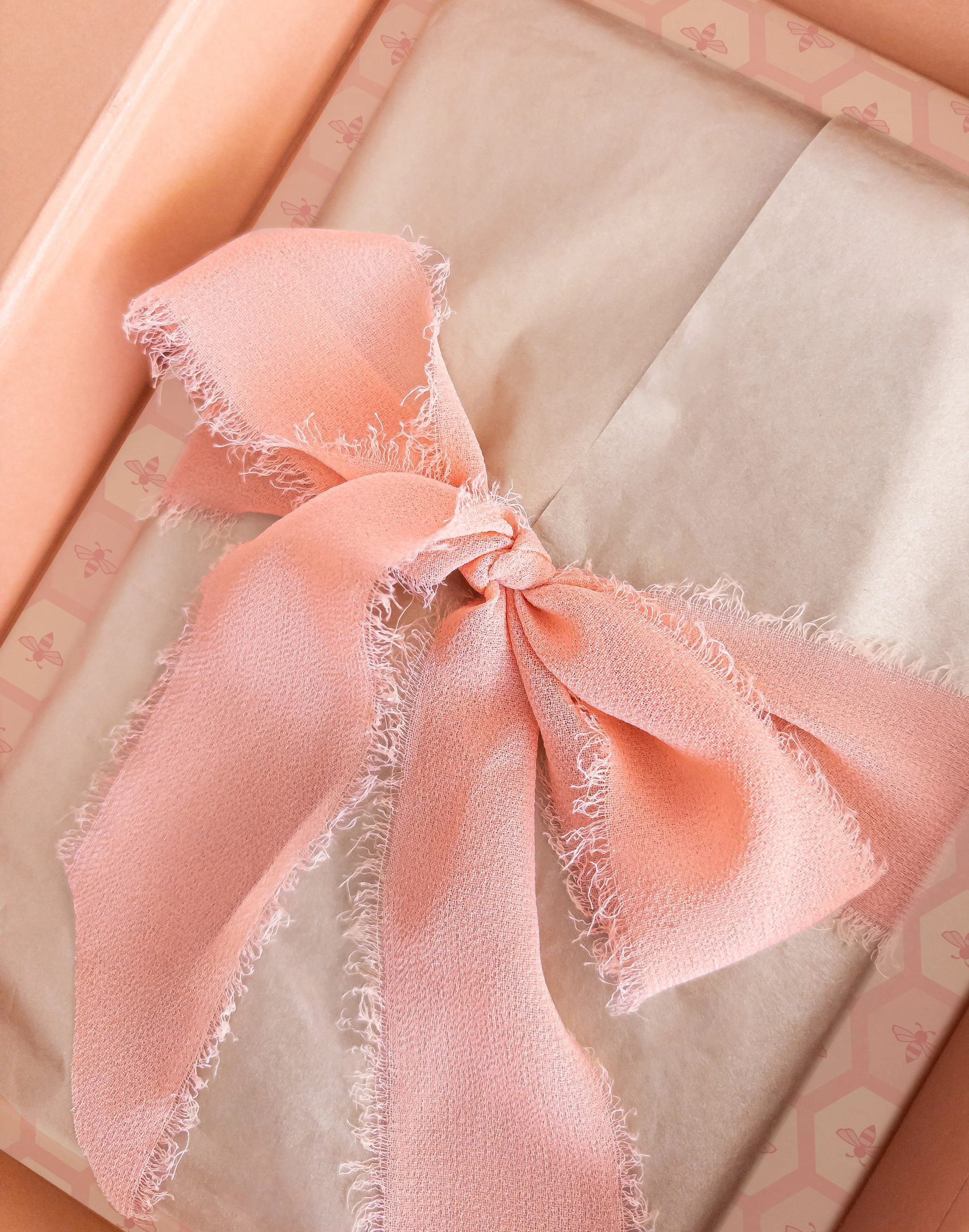 Wrapped around the spine of each book and hand-tied in a bowRose gold flower charm embellishments